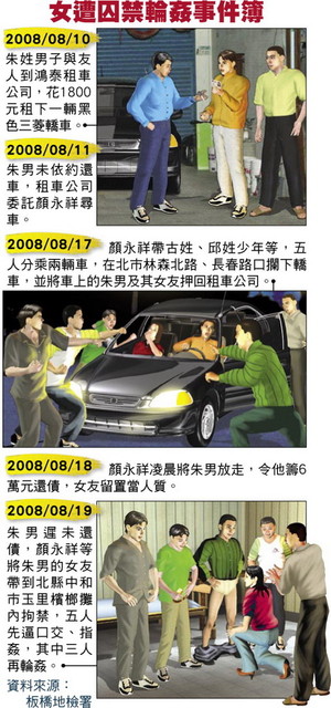 這起駭人聽聞的輪姦案發生在去年八月。八月十日,朱姓男子和友人到台北縣板橋市三民路鴻泰租車公司,以一千八百元代價租了一輛黑色三菱轎車,隔天租約到期後,朱卻避不見面,拒絕還車,車行於是找來長期合作的討債人員顏永祥幫忙找車。