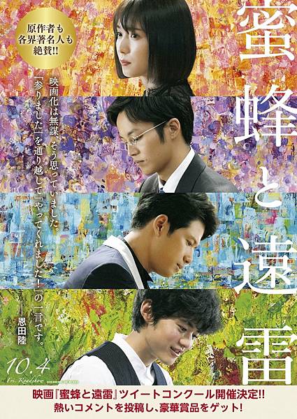 最後想說,這片的片名叫《蜜蜂與遠雷》,英文片名卻是「傾聽宇宙的聲音」,原作者花了非常多年構思這本小說,對於音樂與演奏家有諸多描繪,讓這本小說一舉拿下多個文學獎,音樂有很多類型,演奏者也是,有的工整如彈琴機器,有的自由奔放不受限制,有的技巧高深,有的情感豐富,而誰能定義藝術的優劣呢?得獎就是最好的音樂嗎?我想觀眾都會對月光下的四手聯彈印象深刻,因為那個段落體現了彈琴的本質,音樂應該是帶來快樂的,可視競賽卻是壓力與辛苦的,日本能有多部文學與影視作品描繪古典音樂相關的故事,台灣卻少見這樣的故事,也許就是文化底蘊與社會價值觀的落差吧。總之,《蜂蜜與遠雷》是一部令人驚訝的好片,但同時需要一些藝術的感受力,去細品當中的文學性。
